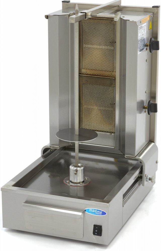 Tento robustní gril je vybaven odkapávací miskou z nerezové oceli, která shromažďuje veškerý tuk. Odkapávací misku lze snadno vyjmout a vyčistit. Motor tohoto grilu na šavli je umístěn ve spodní části. Gril je po stranách často vybaven nerezovými odrazovými sítky. Ty nejsou standardně dodávány, ale lze je objednat zvlášť. Protože tento doner kebab gril pracuje na plyn, obdržíte standardní trysky na zemní plyn (20 - 25 mbar). Trysky na LPG (propan/butan) dodáváme zvlášť (30 - 50 mbar) v plastovém sáčku spolu s návodem k použití. K provedení přestavby ze zemního plynu na LPG si vždy zajistěte odborníka. Nejchutnější grilované pokrmy se připravují na grilu na kebab, ale měli byste mít také elektrický grilovací nůž, abyste mohli maso hladce a rychle odkrojit ze špízu. Ten si můžete objednat zvlášť.