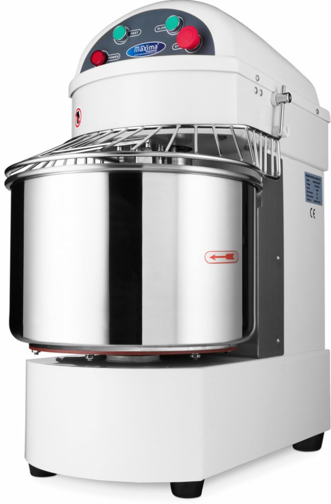 MX Spirálový mixér / hnětač těsta / míchač těsta / spirálový hnětač 20 litrů - 2 rychlosti, Spirálový hnětač MX MSM 20 je profesionální spirálový hnětač. Tento kuchyňský spotřebič je hnětač těsta s velmi silným motorem. To je příjemné, protože tak se těsto pohodlně promísí, takže můžete snadno upéct chutný chléb. S tímto spirálovým hnětačem MX MSM 20 můžete zpracovat až 8 kilogramů mouky a 13 kilogramů těsta (chleba). Tento spirálový hnětač je naštěstí vybaven bezpečnostním spínačem, který vám usnadní používání tohoto kuchyňského spotřebiče. Níže naleznete všechny vlastnosti spirálového hnětače MX MSM 20:, Profesionální spirálový hnětač, Hnětač těsta s velmi silným motorem, S hnacím řetězem a klínovými řemeny, Kovový kryt s odolným povlakem, Nerezová mísa o objemu 20,0 l o 36 x 20 (v) cm, Osa a spirála z nerezové oceli, Rychlosti spirály: otáčky 115 a 187 ot/min, otáčky mísy: Max. množství mouky: 11 a 18 ot: Max. množství těsta: 8 kg, Max: (chlebové těsto), min. množství těsta: 13 kg, min: 6 kg, Ochranný kovový kryt, S bezpečnostním spínačem, Stojí na čtyřech gumových nožičkách, Snadno se čistí, Čistá hmotnost: 90 kg, Rozměry: Š427 x D675 x V853 mm, 230V/50Hz/1Fáze 1100 Watt, Upozornění:Míchací mísa je pevná a nelze ji vyjmout,