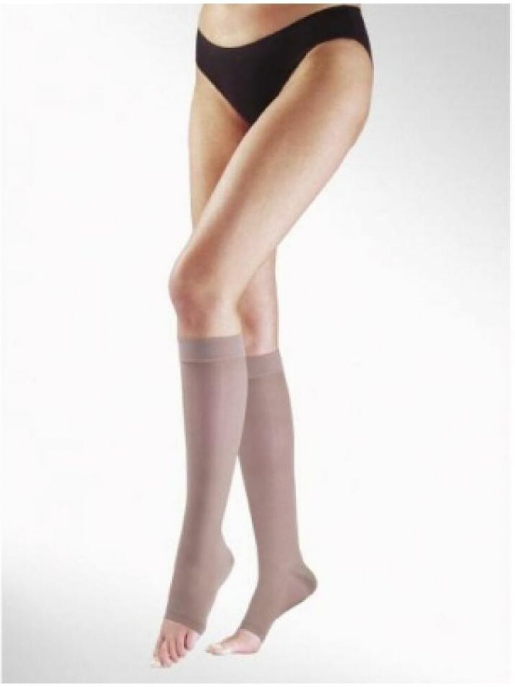 Moderní kompresivní punčochy. Punčochy jsou vyráběny z vysoce kvalitních elastických materiálů s podílem mikrovlákna. Gradient sestupu tlaku působí na krevní oběh a tak zabraňuje pocitu těžkých, unavených a oteklých nohou. Balení obsahuje lýtkové punčochy bez špice velikosti 8N, barva: bronz.