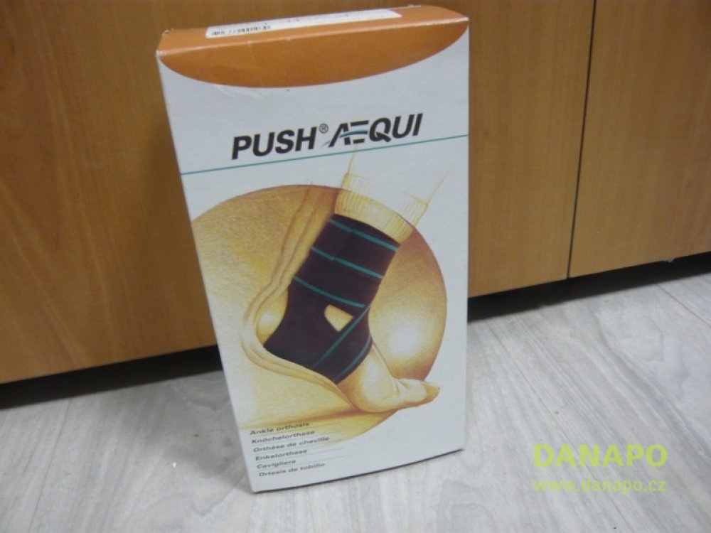Push Aequi je vysoce účinná kotníková ortéza, ve které se pojí efektivní mechanická podpora nemocného kotníku na jedné straně s pohodlností nošení na straně druhé. Pevná opora se nachází výhradně na mediální straně kotníku. Je zajištěna dostatečně tuhým a přitom lehkým plastem, jehož tvar je anatomicky přizpůsoben vnitřnímu kotníku. Laterální oblast je zhotovena z tvarované pěny, která se snadno přizpůsobuje individuální anatomii. Ortéza se připevňuje diagonálním (netažným) páskem. Konečnou stabilitu kotníku poskytují dva kompresivní elastické pásy, které se proti sobě ovíjejí kolem postiženého kloubu. Ortéza je nová, nepoužitá.
