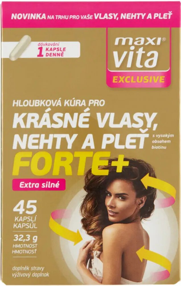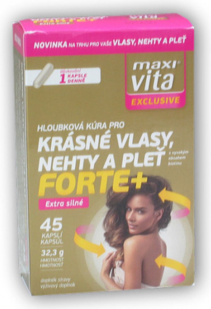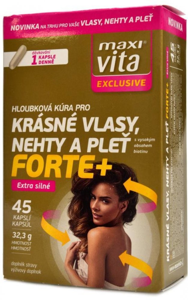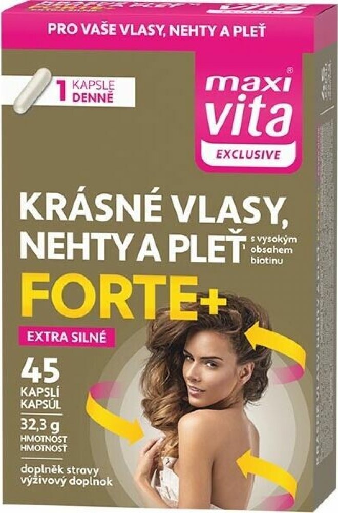 MaxiVita 45 tbl kapsle vlasy, nehty, pleť unisex MaxiVita pro dospělé perorální bez příchutě vitamín B7 (biotin) vlasy, kůže a nehty Kdykoliv Užívejte 1 kapsli denně, vždy po jídle, dostatečně zapijte. Nespecifikováno