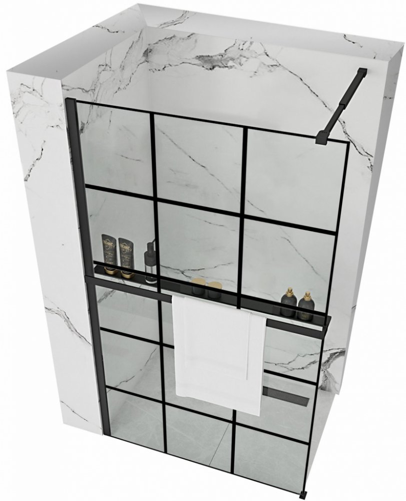 Sprchová zástěna BLER-1 120 cm - černá Jednodílná sprchová zástěna série BLER je vyrobena z 8 mm tlustého tvrzeného bezpečnostního skla v kombinaci s hliníkem s černou povrchovou úpravou. Svým vzhledem zástěna připomíná tradiční japonské oddělovače Shōji. Snadno ji ale lze kombinovat se spousty styly. Od klasického, přes moderní, retro, japonský, minimalistický až po industriální nebo art deco. Zkrátka tato sprchová zástěna s nadčasovým vzhledem zapadne do všech koupelen! Aplikovaná technologie Easy Clean zajišťuje jednoduchou údržbu skla. Sestavení zástěny je universální na obě strany. Levou či pravou orientaci zástěny si zvolíte při montáži. Také si můžete vybrat mezi montáží na sprchovou vaničku nebo přímo na podlahu. Zástěna je uchycena v hliníkovém profilu a ramenem do zdi. Díky regulaci v profilech lze vyrovnat mírné nerovnosti stěn. Zástěna je vybavena hliníkovou policí EVO v černé matné barvě, která nabídne z jedné strany prostornou polici na odkládání hygienických potřeb a z druhé strany praktický jednoramenný věšák na přehození osušky. Parametry: rozměr: 120x195 cm - nastavitelné v šíři 1190-1205 mm délka ramene (nastavitelné): 70-120 cm sklo: čiré, 8 mm uchycující profil: hliníkový, černý matný, šířka profilu: 32 mm Mřížka o síle 17 mm je tvořena speciální černou matnou barvou vytvrzenou při 800°C. Tím je zaručena trvanlivost a vysoká odolnost proti otěru. montáž: na sprchovou vaničku nebo přímo na zem součástí balení je kompletní sprchová zástěna včetně lišt, ramene a montážního materiálu
