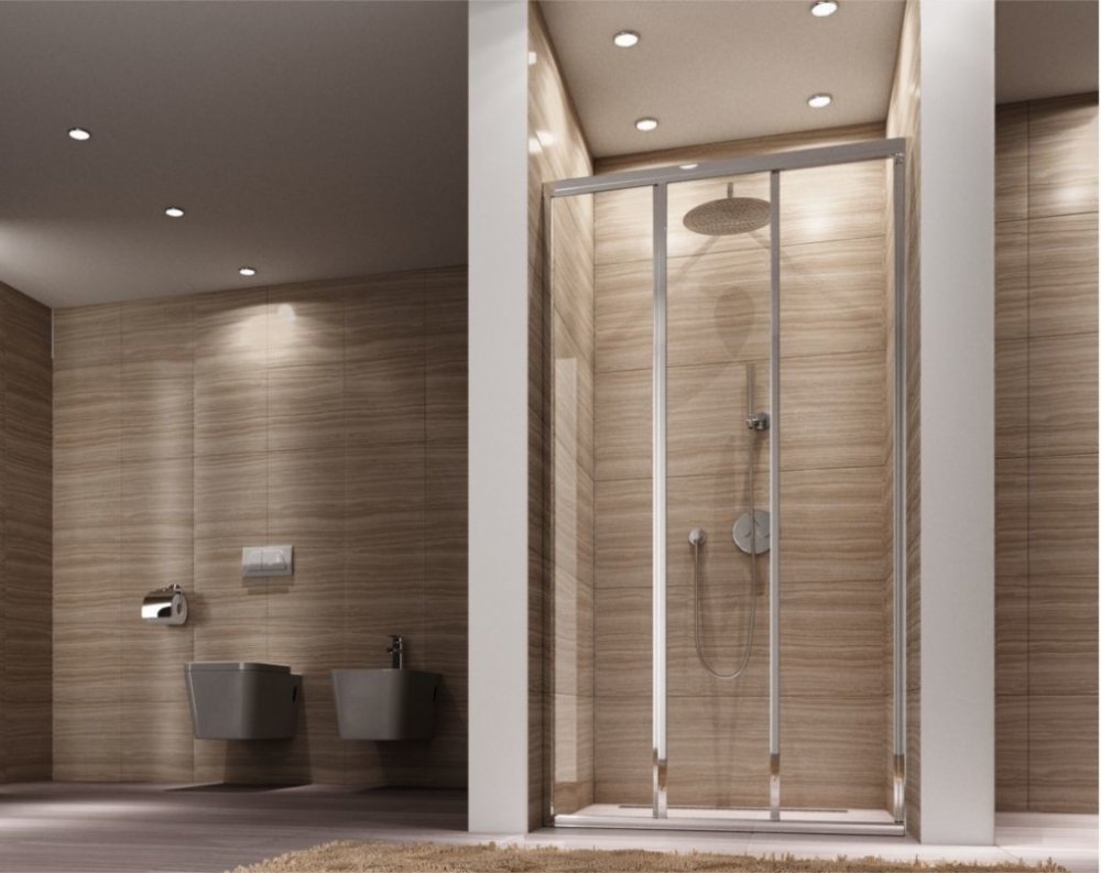 Sprchové dveře ALEX 90 cm Sprchové dveře jsou vyrobeny z 4 mm tlustého tvrzeného čirého skla. Aplikovaná technologie Easy Clean zaručuje jedinečné vlastnosti zabraňující znečištění skla - povrch stačí pouze opláchnout vodou. Dveře jsou uchyceny v chromovaných hliníkových profilech na kolečkách pro posuvné otvírání (jedna stěna stálá a dvě pohyblivé) - viz foto. Dveře jsou univerzální, dají se tedy namontovat jak pro otevírání vpravo, tak vlevo. Rozměr: - 90 x 190 cm (nastavitelné v šíři 815-915 mm)