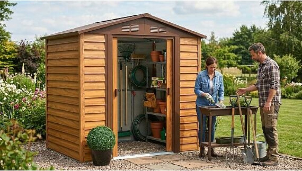 Domek je vyrobený z pozinkovaného vodorovně profilovaného plechu a vzhledově (designově i barevně) se přibližuje dřevěnému domku. Domek je možné použít k uskladnění zahrádkářských, sportovních, bazénových, grilovacích, campingových, motoristických a dalších potřeb. Moderní design, barva, snadná montáž, celoroční použití. Kvalitní materiál s povrchovou úpravou - elektrolyticky pozinkovaný plech s žárově nanesenou barvou. Sedlová střecha, čelní posuvné dveře. Možnost uzamčení (zámek není obsahem dodávky).