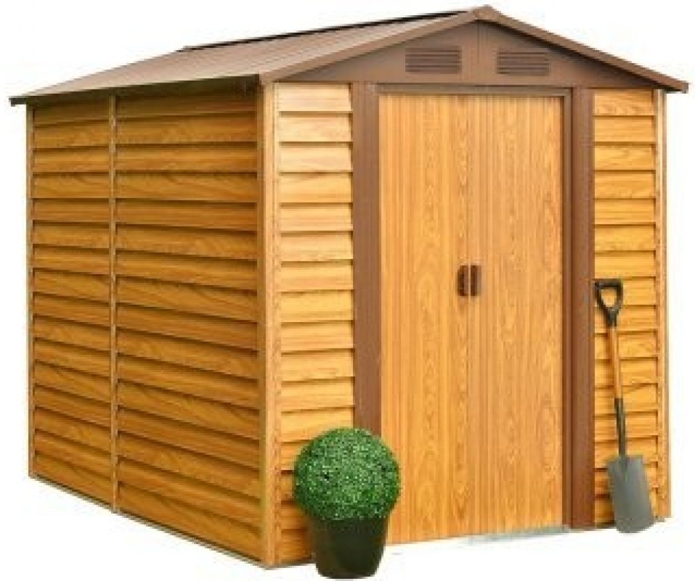 Domek je vyrobený z pozinkovaného vodorovně profilovaného plechu a vzhledově (designově i barevně) se přibližuje dřevěnému domku. Domek je možné použít k uskladnění zahrádkářských, sportovních, bazénových, grilovacích, campingových, motoristických a dalších potřeb. Moderní design, barva, snadná montáž, celoroční použití. Kvalitní materiál s povrchovou úpravou - elektrolyticky pozinkovaný plech s žárově nanesenou barvou. Sedlová střecha, čelní posuvné dveře. Možnost uzamčení (zámek není obsahem dodávky).