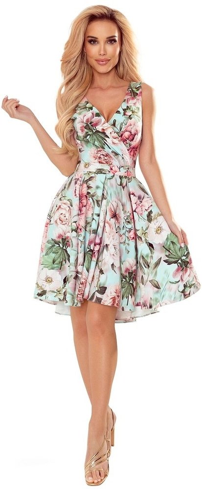 Maya - asymetrické šaty s delšími zády , výstřihem a páskem. Vzor: růžové květy na mátovém pozadí. Na tanec se bude skvěle hodit sukně s delším zadním dílem. Polská výroba. Značka Numoco .