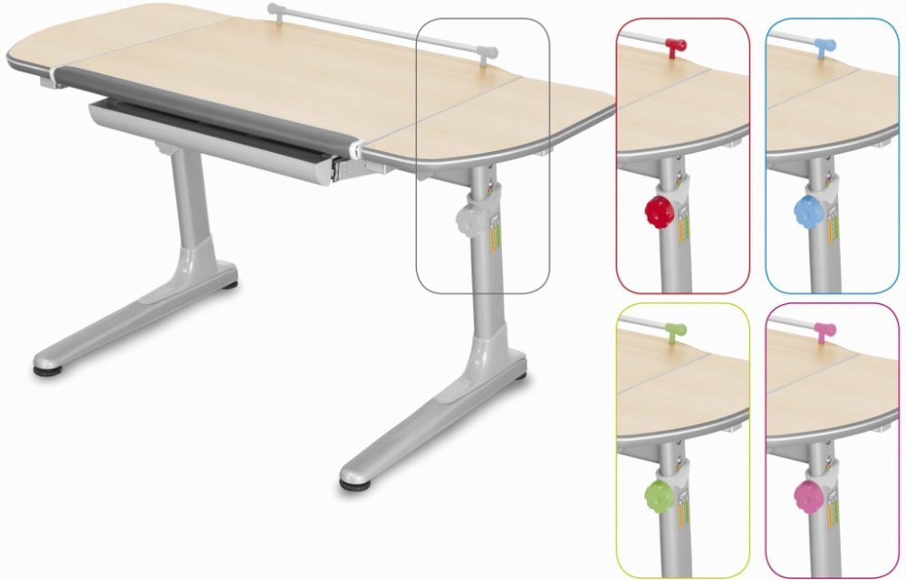 Jednoduché ovládání a bohaté standardní vybavení pomohou k úspěšnému zvládání všech školních povinností. Střed stolu je naklápěcí, na obou stranách jsou vodorovné díly nabízející dostatek odkládacích ploch (sklenice s nápojem, pastelky apod.) Díky odkládacím plochám na obou stranách je tento rostoucí psací stůl vhodný pro praváky i leváky. Bezpečný pohyb v okolí stolu zajišťují kvalitní oblé hrany a zakulacené rohy psací desky. V základní výbavě je praktická narážecí opora zápěstí s pravítkem, velký výsuvný organizér a držáky školní brašny po obou stranách stolu.