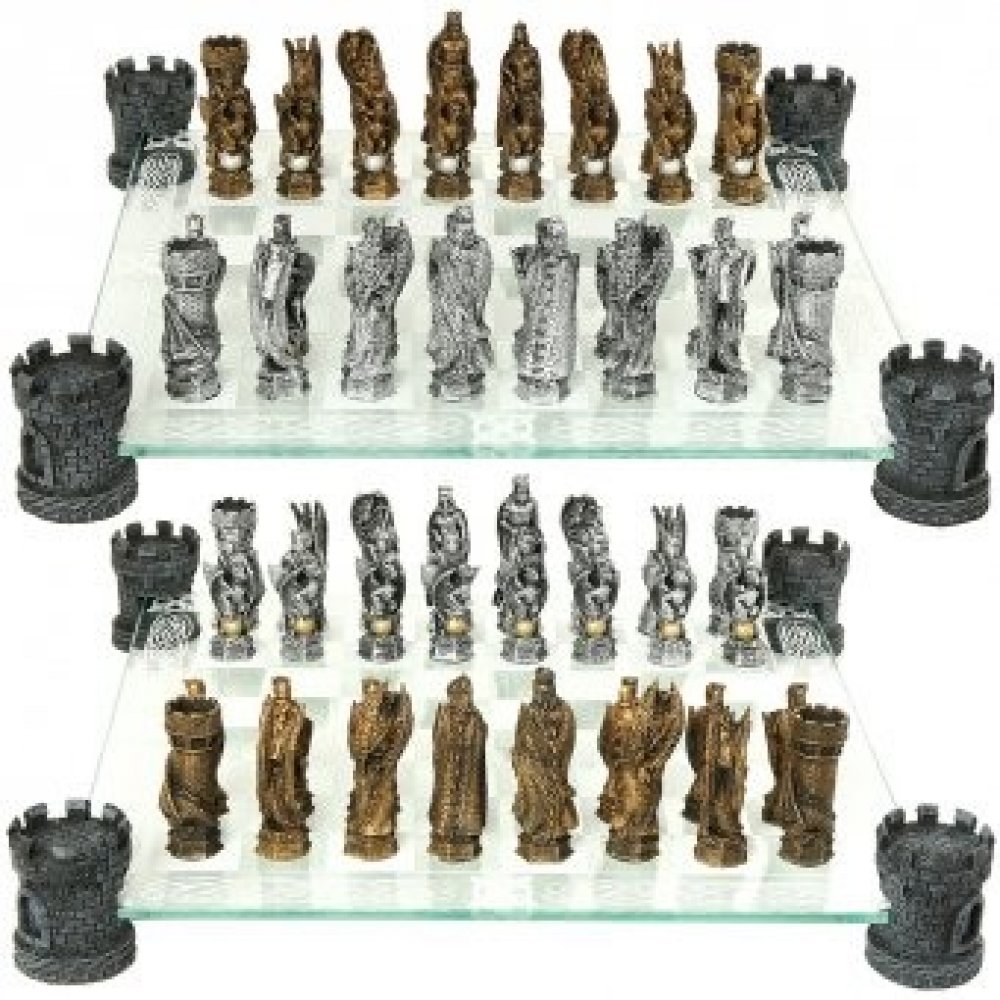 Šachový set obsahuje šachové figurky a krásnou skleněnou šachovnici s rohy v podobě hradních věží, do kterých se šachovnice usadí.