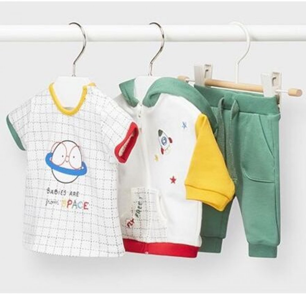 Pestrobarevná mikinka, tepláčky a tričko s obrázkem, to je kojenecký veselý komplet z Newborn kolekce Mayoral.