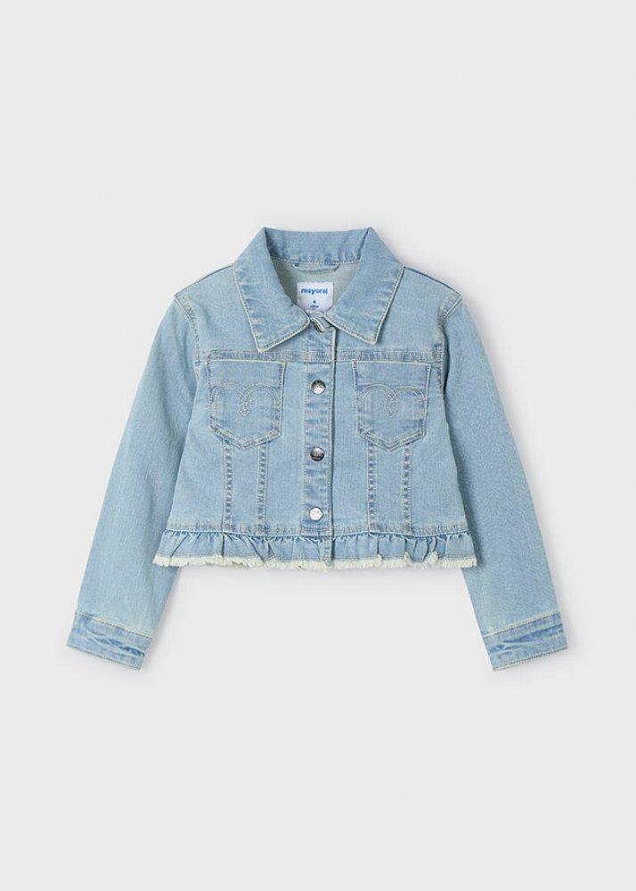 Mayoral dívčí riflová bunda s límečkem a volánkem. Bunda je z velmi příjemné, odlehčené rifloviny. Bunda má zapínání na cvoky, na přední straně jsou 2 funkční kapsy.