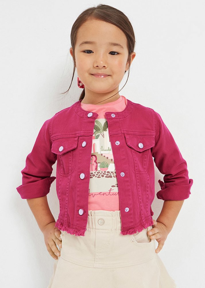 Mayoral dívčí odlehčená riflová bunda s kapsami. Bundička je z velmi příjemného materiálu. Na přední straně má zapínání na patenty. Na manžetách u rukávů, a okolo pasu má roztřepení.