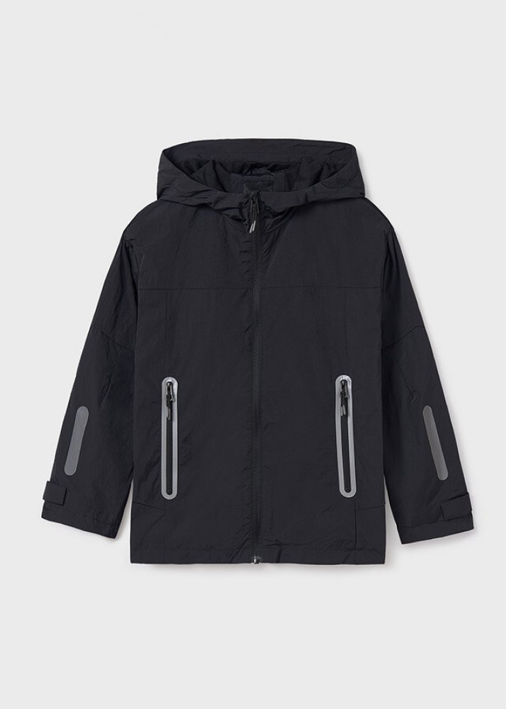 Mayoral chlapecká šusťáková bunda s kapucí. bunda je z příjemného, lehoučkého materiálu. Na přední straně je zip a dvě funkční kapsy. Na rukávech a kolem kapes jsou reflexní aplikace.
