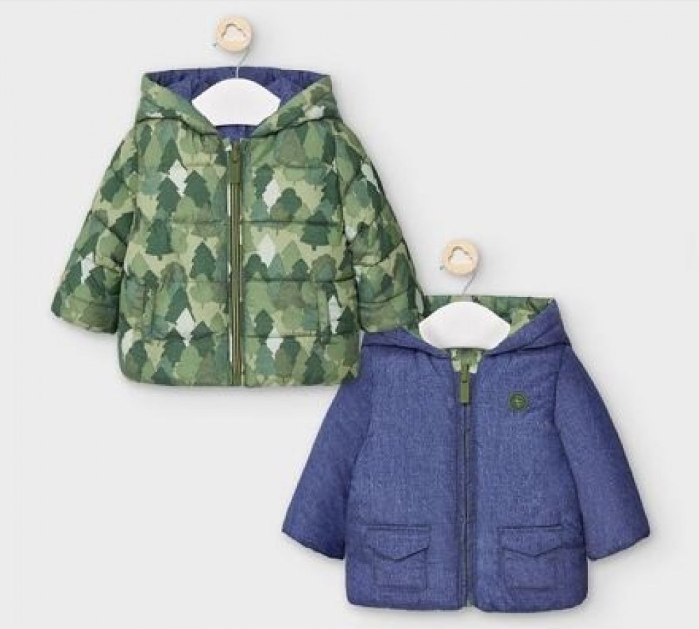 Z jedné strany zelená bundička se stomečky, z druhé strany jednobarevná v modré jeans barvě, to je nádherná zimní oboustranná bundička s kapucí pro malé drobečky od módní značky Mayoral v kolekci Newborn. vrchní vrstvy z jemného šusťákového materiálu: 100% polyester výplň: 100% polyester artikl: Mayoral 2471-35 Musgo