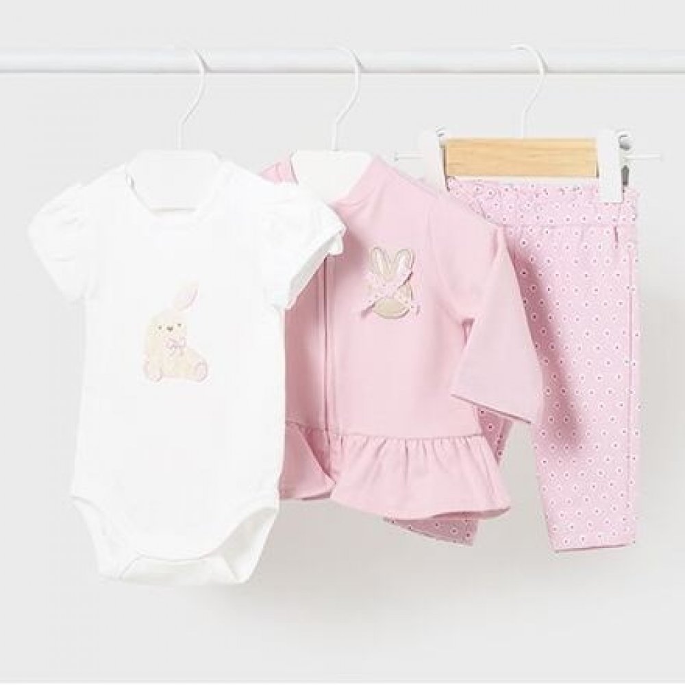 Značkový komplet s motivy zajíčků z kolekce Newborn Mayoral pro nejmenší holčičky. Mikina na zip bez kapuce, body s krátkým rukávem a pohodlné tepláčky, to je perfektně sladěné kojenecké oblečení. kvalitní oblečení pro nejmenší z kolekce Ecofriends bodyčko s rozepínáním na obou ramenech a mezi nožičkami pro snadné oblékání a přebalování miminka materiál: 95% bavlna, 5% elastan artikl: Mayoral 1813...