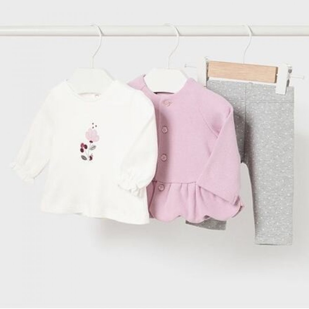 Propínací svetýrek s volánkem, legínové kalhoty a tričko s dlouhým rukávem, to je krásně sladěné kojenecké oblečení od značky Mayoral z kolekce Newborn ecofriends. svetýrek s volánkem podšitým bavlněným úpletem tričko celorozepínací na zádičkách na baby patenty materiál svetýrku: 58% bavlna, 40% polyester, 2% elastan, podšívka na kanýrku: 100% bavlna puntíkaté elastické legíny - materiál: 95% bavlna, 5% elastan tričko ve smetanové barvě s vyšitou kytičkou - materiál: 95% bavlna, 5% elastan artikl: Mayoral 2756-15 Violet