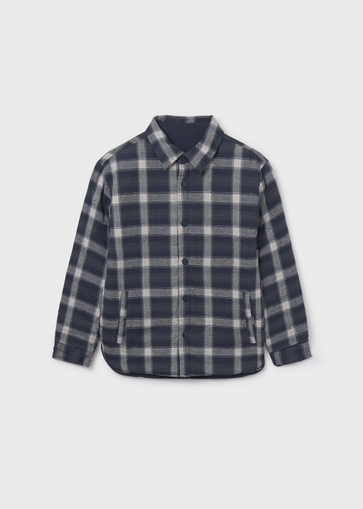 Mayoral chlapecká oboustranná košile s dlouhým rukávem. Z jedné strany je košile z velmi příjemného, 100% bavlněného materiálu, ze strany druhé je pevnější látka, košili tak lze nosit třeba jako bundu. Zapínání je na cvoky .