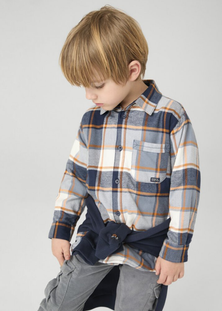 Mayoral chlapecká kostkovaná košile s límečkem u krku. Košile je z velice příjemného materiálu a je podšita bavlnou. Košile má na přední straně jednu funkční kapsičku, a zapínání na knoflíčky, stejně tak i na rukávech. Košili lze využít jako mikinu/bundu.