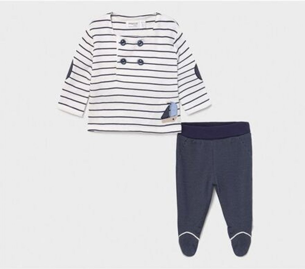 Pokud hledáte dokonale sladěný outfit v námořnickém stylu pro miminka a batolata, tak tento obleček pro chlapečky rozhodně nezklame. Soupravička Mayoral obsahuje polodupačky - kalhoty a triko s dlouhým rukávem, které lze využít i jako slabou mikinku. velikost 68 má polodupačky s ťapkami, od velikosti 74 výše jsou kalhoty bez ťapek knoflíky na pružném triku jsou rozepínací pro snadné oblékání mater...
