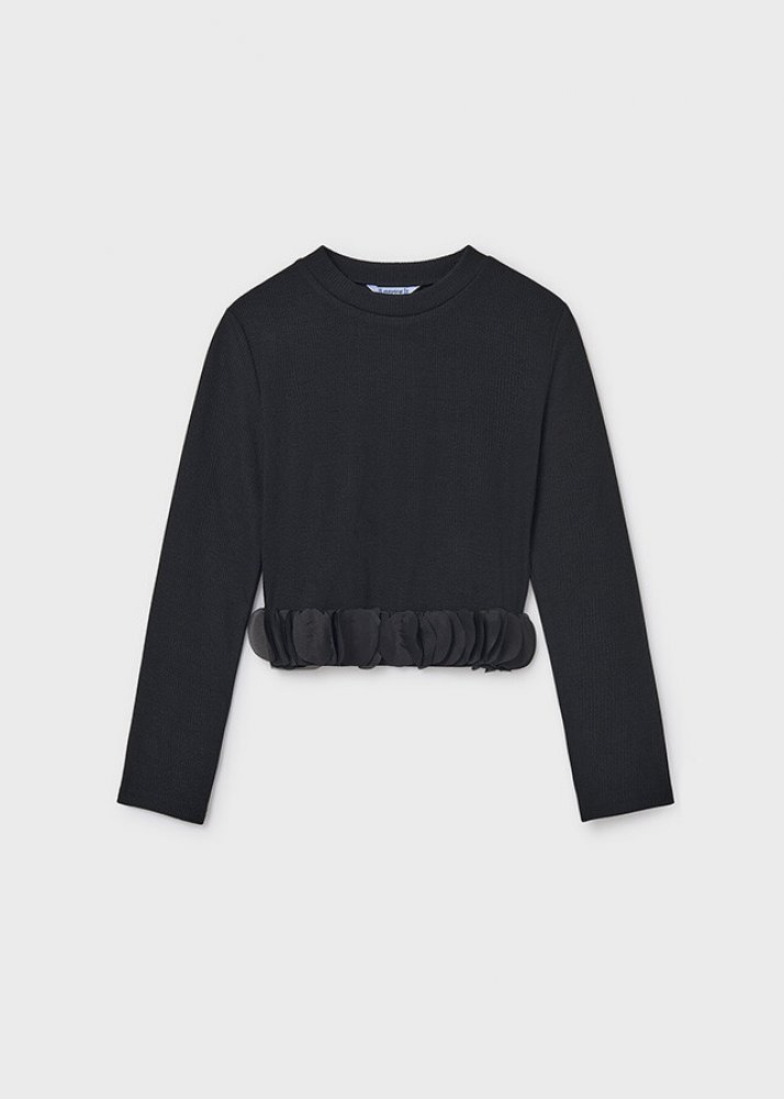 Mayoral dívčí triko s dlouhým rukávem a lístečkovou aplikací. Triko je z velmi příjemného, pružného materiálu, ve spodní části je aplikace černých lístečků. U krku je kulatý výstřih. Triko je kratší délky.