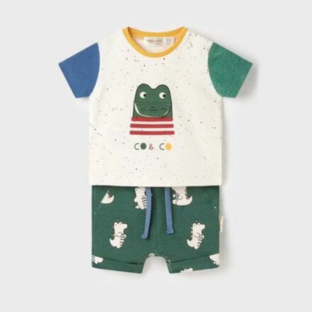 Dinosauří pestrobarevné tričko s odklápěcí tlamičkou a zelené kraťasy poseté dinosaury tvoří krásný letní komplet pro mimča a batolata. letní oblečení od dětské značky Mayoral, kolekce Newborn materiál: 95% bavlna, 5%elastan artikl: Mayoral 1217-23 Multicolor