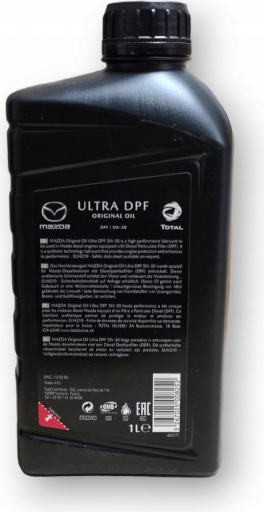 Mazda Original Ultra DPF 5W-30 Syntetický, vysoce výkonný motorový olej určený především pro moderní osobní a užitkové vozy vybavené filtrem pevných částic (DPF), který ve výfukových plynech dieselových motorů zachycuje saze a jiné částice. Motory vybavené DPF splňují emisní normu EURO IV. Optimalizuje výkon motoru při co nejnižší spotřebě paliva. Nepoužívejte do benzínových nebo jiných naftových motorů, které nejsou vybaveny DPF. Olej vyroben především pro motory vozidel značky MAZDA, ale samozřejmě je určen pro jakýkoliv typ osobního, užitkového či dodávkového vozu. Při výběru oleje spoléhejte na radu výrobce. V návodech výrobci doporučují oleje odpovídající danému modelu. TECHNICKÉ ÚDAJE SAE 5W-30 ACEA C1