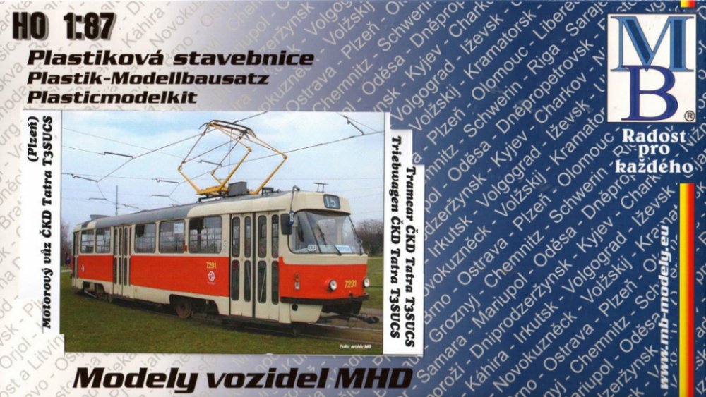 1:87 Stavebnice tramvaje ČKD Tatra T3SUCS, DP Praha, epocha VI MB modely. Plastikové modely, Autobusy a tramvaje. Stavebnice tramvaje ČKD Tatra T3SUCS, DP Praha, epocha VI. Stavebnice obsahuje plastové výlisky, čiré díly zasklení oken a dveří, obtisky, kovový pantograf a detailní obrázkový návod pro stavbu modelu.