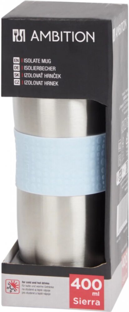Praktický termohrnek AMBITION Sierra je ideálním společníkem pro každodenní cestování, do práce, školy nebo na výlety. Díky dvojité stěně z nerezové oceli udrží váš nápoj déle teplý či studený a silikonový pásek zajistí pohodlné a bezpečné držení.