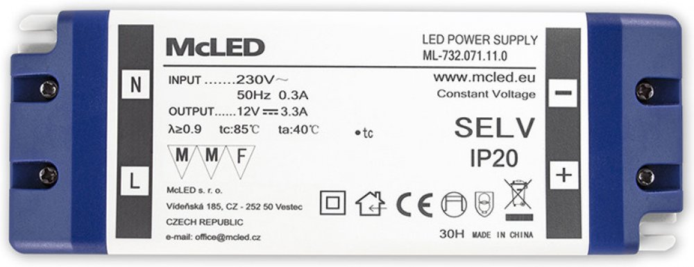 LED napájecí zdroj McLED ML-732.071.11.0 - 40W, DC12V/3,3A, IP20, plastový