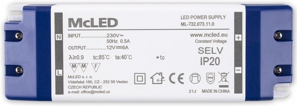 LED napájecí zdroj McLED ML-732.073.11.0 - 72W, DC12V/6A, IP20, plastový