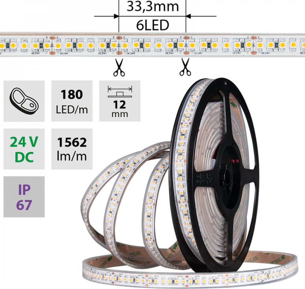 Stmívatelný LED pásek SMD3528 na čerstvé maso (3300-3600K), 14,4W, 180LED, 1405lm/m, segment 33mm, 6LED/segment, IP67, DC 24V, životnost 54000h, šíře 12mm, bílý PCB pásek, max. délka pásku při jednostranném zapojení: 5m, opatřen samolepící páskou 3M, UV stabilní.