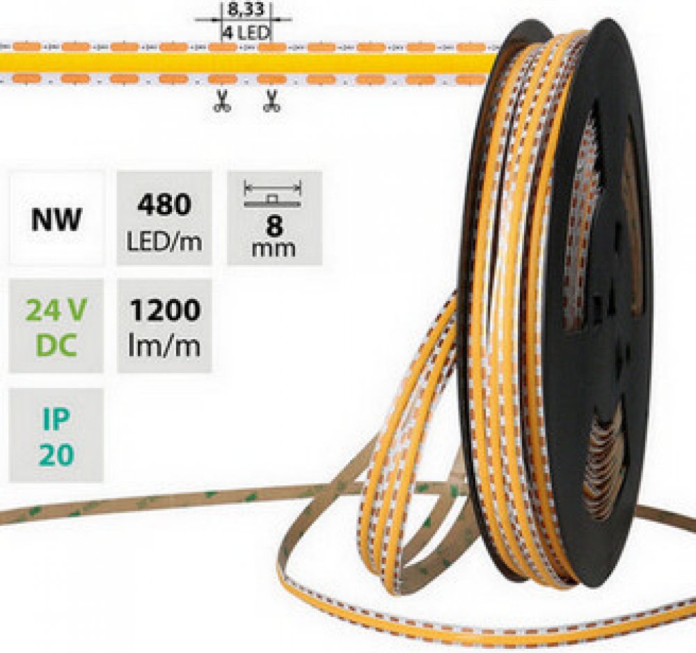Stmívatelný LED pásek McLED 24V COB ML-126.122.90.2 disponuje stmívatelností v denní bílé barvě v rozmezí 4 000 - 4 400 K. Tento LED pásek dále vyniká výjimečně vysokou věrností barev CRI >90 A, moderní COB technologií a snadnou instalací díky samolepicí pásce. Specifikace LED pásku McLED 24V COB neutrální bílá 480LED/m 12W/m CRI90 8mm, ML-126.122.90.2 LED pásek McLED 24V COB neutrální bílá 480LED...