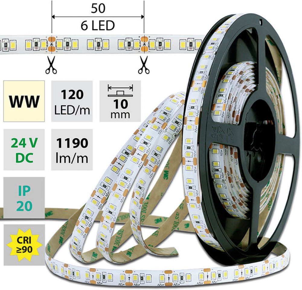 LED pásek SMD2835, 2800-3100K (teple bílý WW), 14W, 120LED, 1190lm/m, segment 50mm, 6LED/segment, IP20, DC 24V, životnost 54000h, šíře 10mm, bílý PCB pásek, max. délka pásku při jednostranném zapojení: 8m, opatřen samolepící páskou 3M, UV stabilní. Balení 50m.