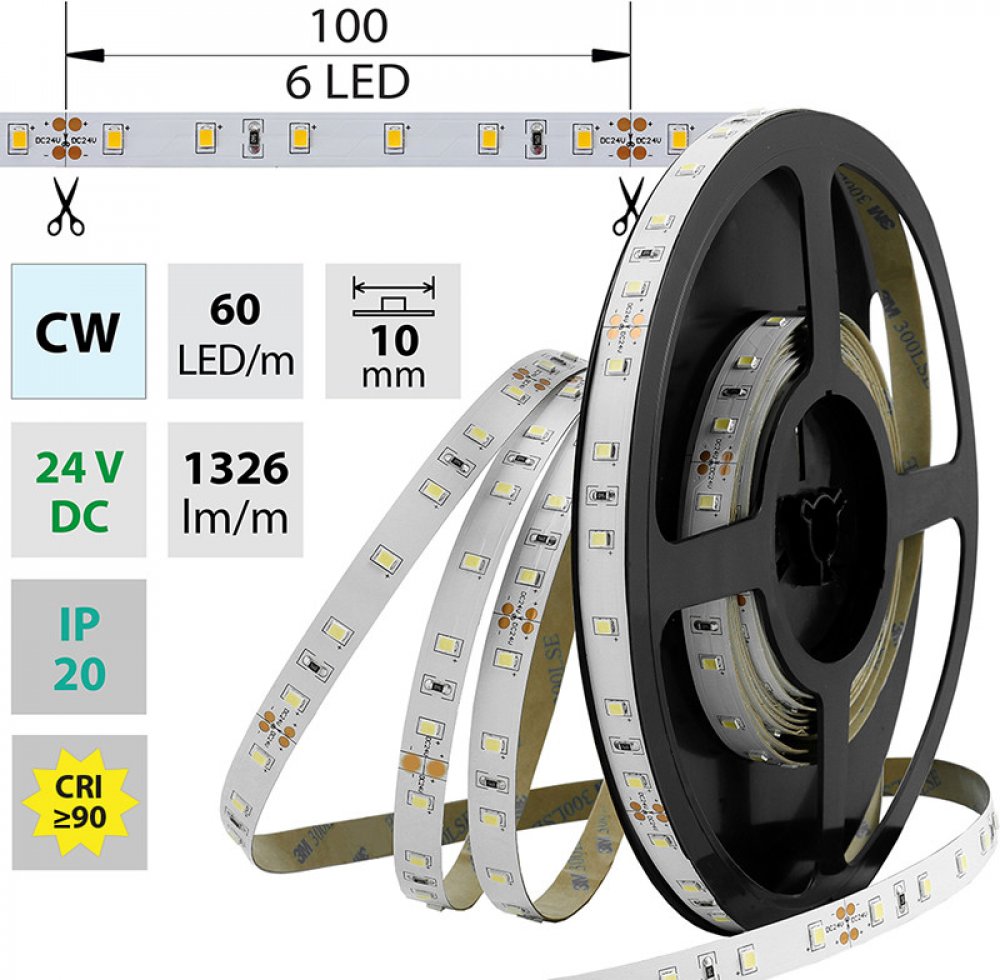 LED pásek SMD2835, studená bílá (6000K), 14,4W, 60LED, 1326lm/m, segment 100mm, 6LED/segment, IP20, DC 24V, životnost 54000h, šíře 10mm, bílý PCB pásek, max. délka pásku při jednostranném zapojení: 5m, opatřen samolepící páskou 3M, UV stabilní.
