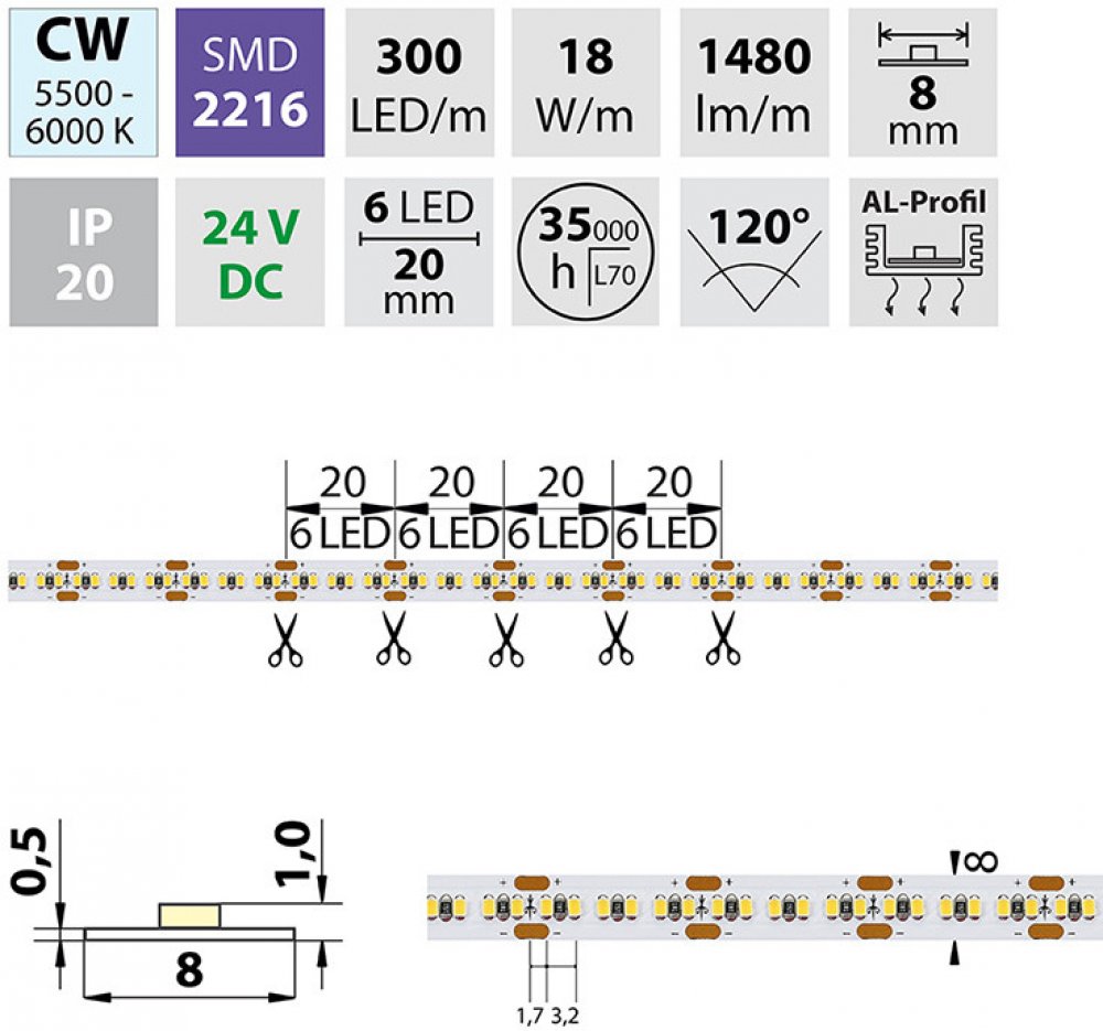 LED pásek SMD2216, studená bílá (6000K), 18W, 300LED, 1480lm/m, segment 20mm, 6LED/segment, IP20, DC 24V, životnost 54000h, šíře 8mm, bílý PCB pásek, max. délka pásku při jednostranném zapojení: 5m, opatřen samolepící páskou 3M, UV stabilní.