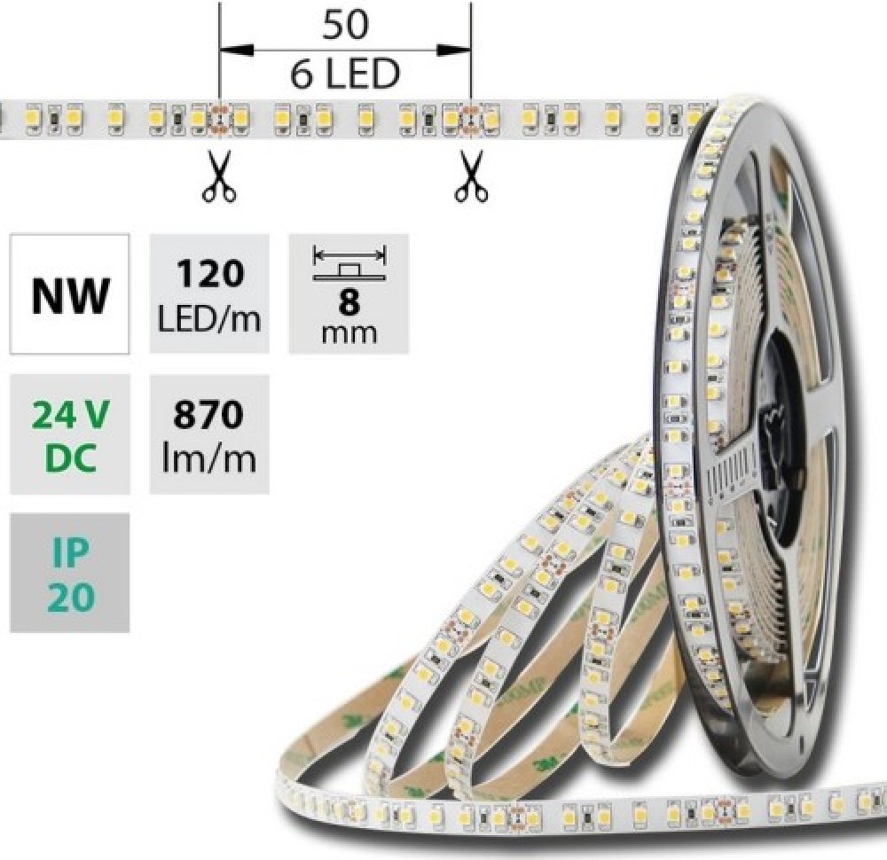 LED pásek SMD3528, neutrální bílá (4200K), 9,6W, 120LED, 870lm/m, segment 50mm, 6LED/segment, IP20, DC 24V, životnost 54000h, šíře 10mm, bílý PCB pásek, max. délka pásku při jednostranném zapojení: 7m, opatřen samolepící páskou 3M, UV stabilní. Délka 50m.