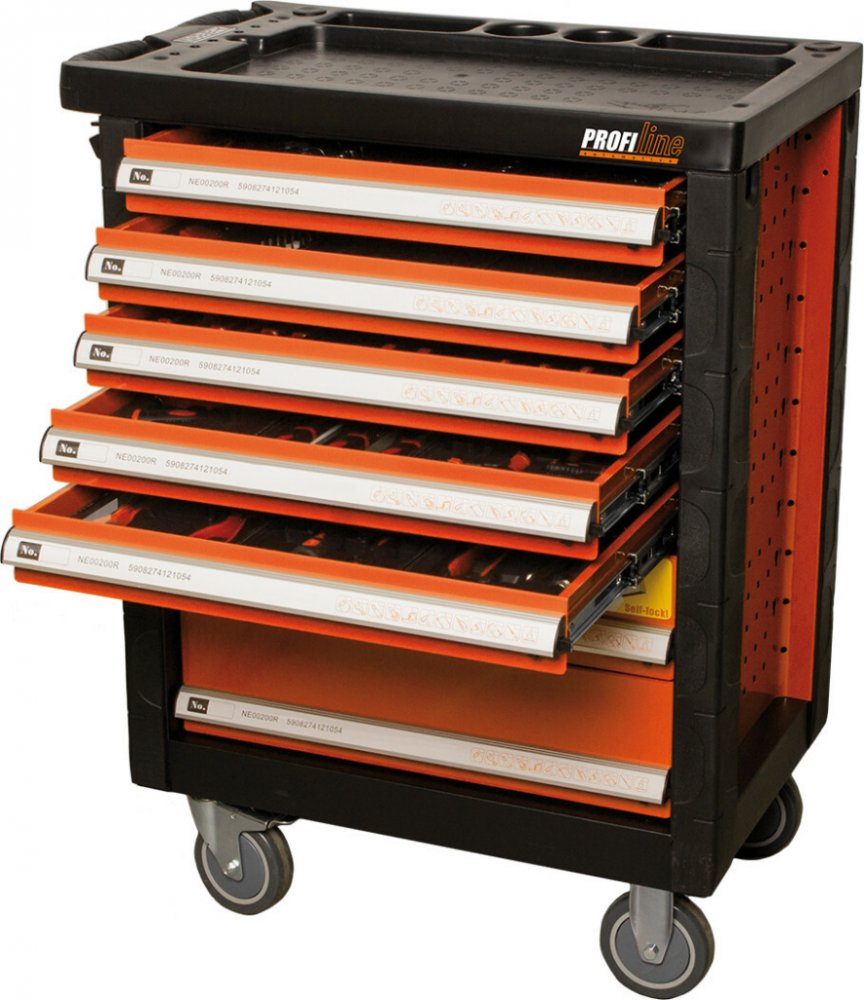 Dílenský montážní vozík vybavený s nářadím 220 ks – AUTOMOTIVE MPPL200Bytelně postavený montážní vozík obsahující různé druhy nářadí a přípravků pro dílnu i servis.Pohodlí při převážení je zajištěno madlem s ergonomickým tvarováním a gumovými kolečky: 2 jsou pevně uchycená, 2 jsou v otočných konzolích. Vozík je možno zabrzdit.Vrchní deska je využitelná k odložení drobností. Vybavení obsahuje 15 kazet s nářadím:- ráčna 1/2”, prodlužovací nástavec (13 a 25 cm), trhák (25 cm), 8 cm kloub, 1/2” hlavice (8, 9, 10, 11, 12, 13, 15, 16, 17, 19, 20, 21, 22, 24, 27, 30, 32 mm)- ráčna 1/4”, prodlužovací nástavec (10 cm), trhák (5 cm), 4 cm kloub, 1/4” hlavice (4, 4, 5, 5, 5, 5, 6, 7, 8, 9, 10, 11, 12, 13, 14 mm)- ráčna 3/8”, prodlužovací nástavec (15 a 8 cm), 6 cm kloub, 17 cm trhák, hlavice na zapalovací svíčky, 3/8” hlavice (6, 7, 8, 9, 10, 11, 12, 13, 14, 15, 16, 17, 18, 19, 20, 21, 22 mm), TORX-E hlavice (E10, E11, E12, E14, E16, E18, E20)- kombinované kleště, štípací kleště, kleště s dlouhými čelistmi- kladiva (2 ks)- „SIKO” kleště, samosvorné upínací kleště- šroubováky ploché, 7 kusů: 5×100 – 6×150 – 8×175 – 4×100 – 4×75 – 3×75 – 6×38 mm- šroubováky křížové 7 kusů: 2×125 – 3×150 – 3×200 – 2×100 – 1×100 – 0×75 – 2×38 mm- šroubováky izolované ploché: 4×100 5, 5×125 6, 5×150; křížové: 3×75 2×100 1×100; elektrikářské šroubováky: plochý: 2 mm 1, 8 mm 2, 5 mm 3 mm; křížový: 3 ks; TORX šroubováky (T9, T10, T15, T20, T25, T27, T30, T40)- 6 šroubováků s T-rukojetí (Imbus): – 2, 5×100 – 3×100 – 4×150 – 2×100 – 5×150 – 6×150- 5 pilníků- úhloměr, svinovací metr 5 m, pila, pravítko- hlavice prodloužené 1/4” (5-6-7-8-9-10-11-12-13 mm); Imbus souprava s uzávěrem (H3, H4, H5, H6, H7, H8); TORX hlavice zástrčné 1/4” (T8, T10, T15, T20, T25, T27, T30, T40), ploché bity plochý 1/4” (SL4, SL5.5, SL7); bity Phillips a Pozidriv 1/4” (PZ1, PZ2, PZ3, PH1, PH2, PH3); Imbusové klíče (1.5, 2, 2.5, 3, 4, 5, 6, 8, 10 mm)- 17 plochých klíčů s ráčnou: 6, 7, 8, 9, 10, 11, 12, 13, 14, 15, 16, 17, 18, 19, 20, 21, 22 mm- 8 zahnutých klíčů (trhák): 6×7, 8×9, 10×11, 12×13, 14×15, 16×17, 18×19, 20×22 mm