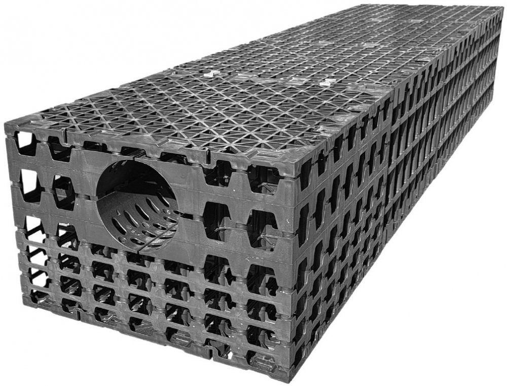 Flexibilní a vysoce účinný vsakovací blok 1200 l vsakování a retenci dešťových vod. Jeden blok o váze cca 60 kg nahradí ∼ 4800 kg štěrku (4 m3) a umožní Vám snadnou revizi. Dělící filtr zachová retenční funkci po celou dobu životnosti. Díky vsakovacímu systému můžeme odlehčit přetížené kanalizační síti a zabránit nadměrnému zatěžování ČOV. Při používání těchto bloků se nekladou žádné hranice. Drenážní systém Vám ušetří místo, čas i peníze. Odvodňovací systém můžete poskládat z jednoho nebo více modulů. Lze položit i vice řad vedle sebe pro zvětšení vsakovací schopnosti. Počet prvků závisí na místních srážkových poměrech, na velikosti odvodňovací plochy a v neposlední řadě na propustností půdy.