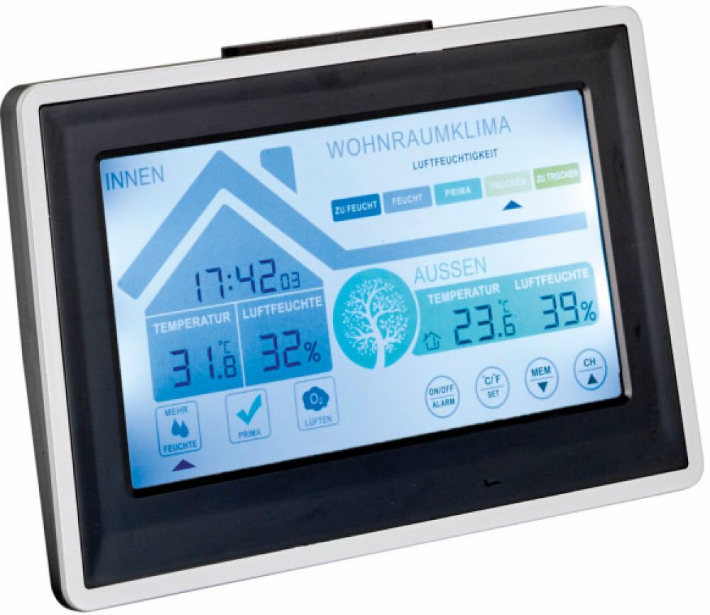 - Multifunkční displej: Čitelný a přehledný LCD displej, který současně zobrazuje vnitřní a venkovní teplotu a předpověď počasí.