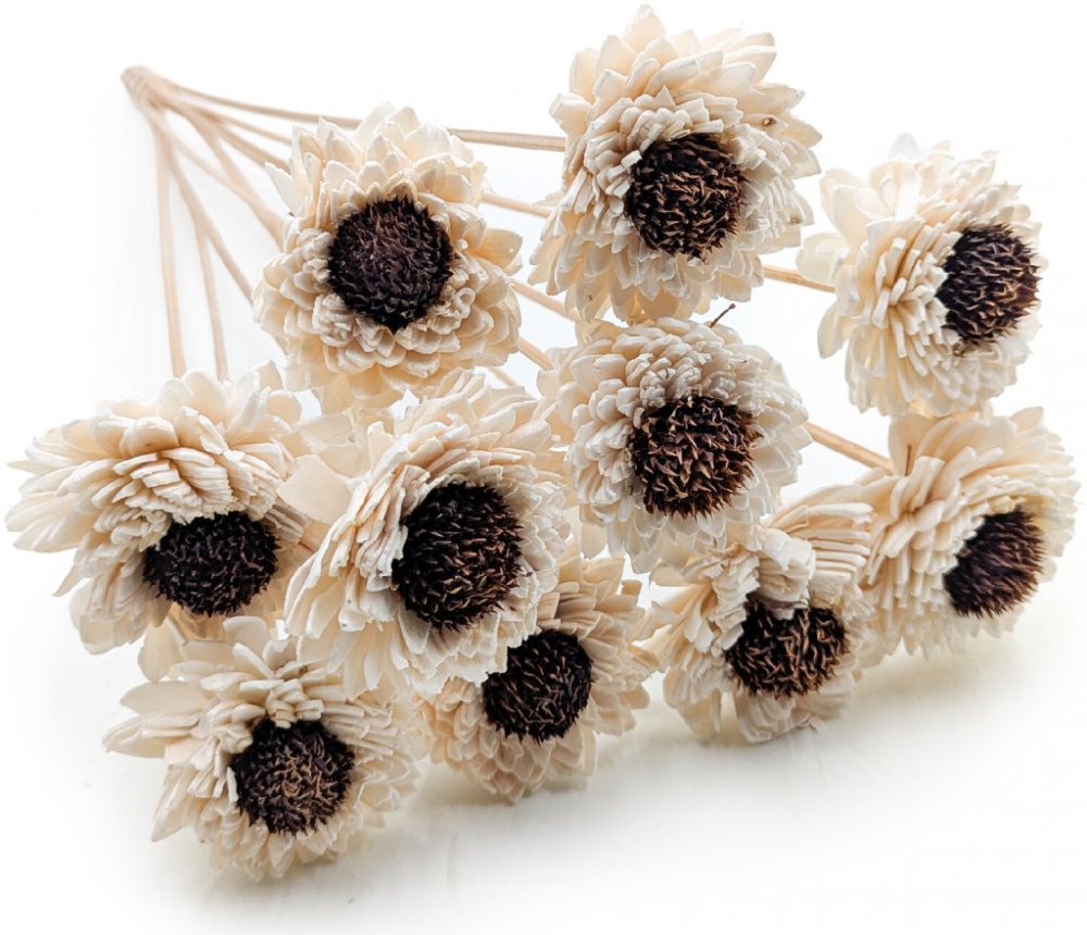 Shola Zinia Daisy je ručně tvarovaná dekorace, inspirovaná tvarem cínie a sedmikrásky; každý květ má průměr přibližně 6 cm a je umístěn na dřevěném stonku o délce 45 cm. Díky subtilní struktuře okvětních lístků připomíná čerstvou, luční květinu – plnou přírodního půvabu a jednoduchosti. Květiny Shola Zinia Daisy jsou vytvářeny z lehkého, přírodního materiálu rostlinného původu; každý exemplář je unikátní – může se lišit uspořádáním okvětních lístků, tvarem nebo odstínem. Drobné pomačkání či nepravidelnosti jsou přirozenou vlastností ruční práce, která podtrhuje autenticitu produktu, přičemž okvětní lístky lze opatrně narovnat nebo ručně dotvarovat. Model Shola Zinia Daisy spojuje lehkost sedmikrásky a formu cínie, čímž vytváří kompozici plnou svěžesti a půvabu; ideálně se hodí do aranžmá ve stylu boho, rustikálním, japandi a přírodním, a skvěle se uplatní v kyticích, věncích a dekoracích interiérů. Květiny Shola Zinia Daisy jsou vhodné pro svatební kytice a kompozice, boho a japandi aranžmá, DIY projekty a sezónní dekorace, a slouží také jako ozdoby stolů, váz a svícnů.