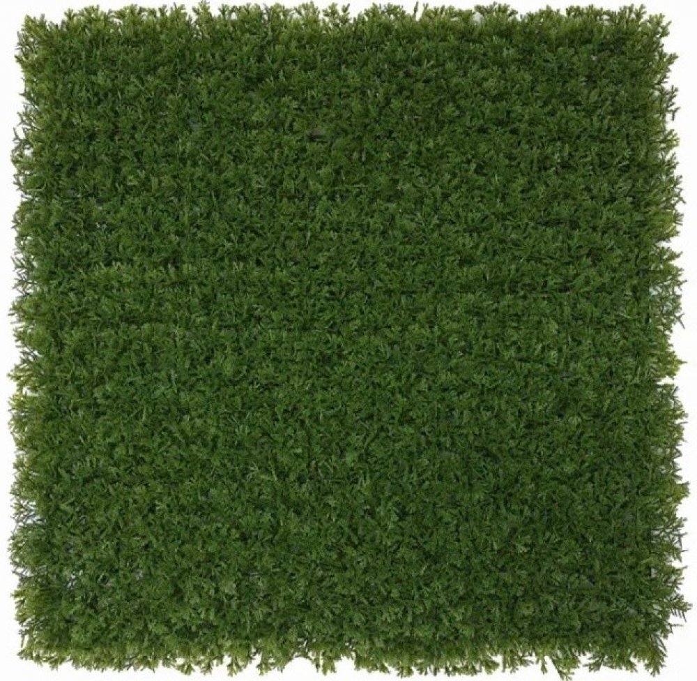 Realistická imitace mechu, která je umístěna na dílci o rozměru 50 x 50 cm. Tento mech je plochý a tmavě zelený. Tyto panely mechu je možné využít například na vytvoření interiérové mechové zdi.