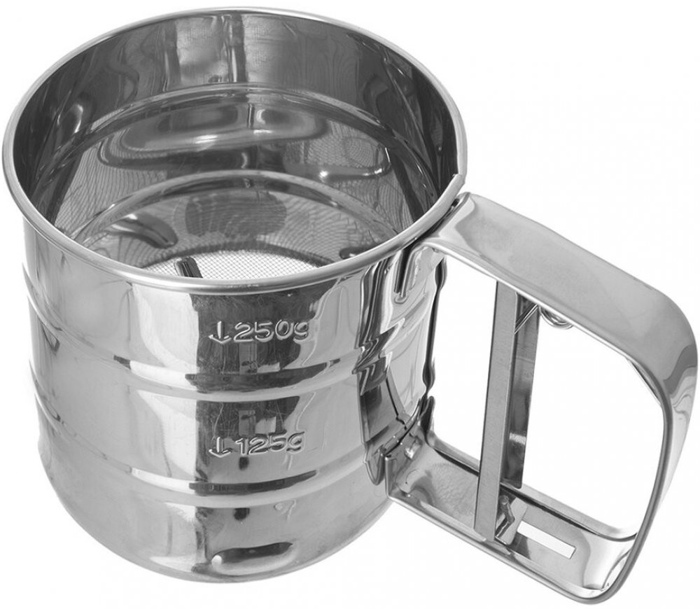 Nerezové sítko pomůže provzdušnit mouku při přípravě těsta k pečení sladkých koláčů, buchet i slaných dobrot. Stačí jednoduše naplnit odvážené množství mouky, moučkového cukru či kakaa, několikrát stisknout mechanismus držadla a mouka bude prosáta skr sítko na dně. S odhadem množství pomůže i míra pro 125 g a 250 g, vyznačená z vnější strany nádoby.