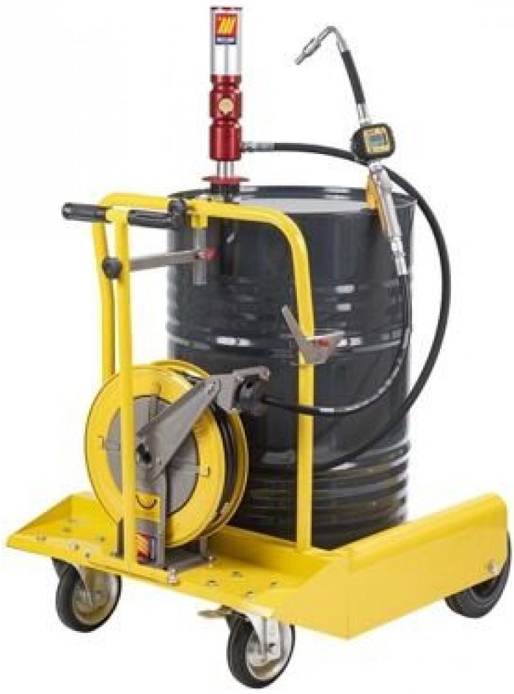 Pneumatické olejové čerpadlo do sudu 180 - 220 litrů (MECLUBE 022-1195-000, poměr tlaku 3:1, výkon 30 l/min., délka sací trubky 940 mm), výdejní pistole s digitálním kalibrovatelným průtokoměrem a s ohebnou koncovkou (MECLUBE 024-1233-C00), navíjecí buben s tlakovou 10 m hadicí (MECLUBE 070-1206-410), komfortní vozík (MECLUBE 030-1405-000, 4 kolečka, ojka, brzda, možnost montáže navíjecího bubnu.....