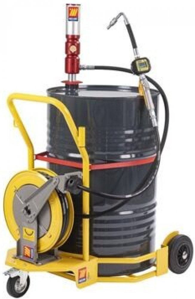 Pneumatické olejové čerpadlo do sudu 180 - 220 litrů (MECLUBE 020-1205-000, poměr tlaku 5:1, výkon 28 l/min., délka sací trubky 940 mm), výdejní pistole s digitálním kalibrovatelným průtokoměrem a s ohebnou koncovkou (MECLUBE 024-1233-C00), navíjecí buben s tlakovou 10 m hadicí (MECLUBE 070-1206-410), komfortní vozík (MECLUBE 030-1398-000, 3 kolečka...) atd. V této sestavě použité olejové čerpadlo...