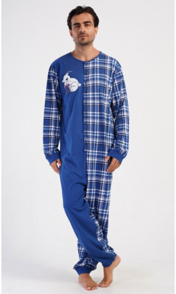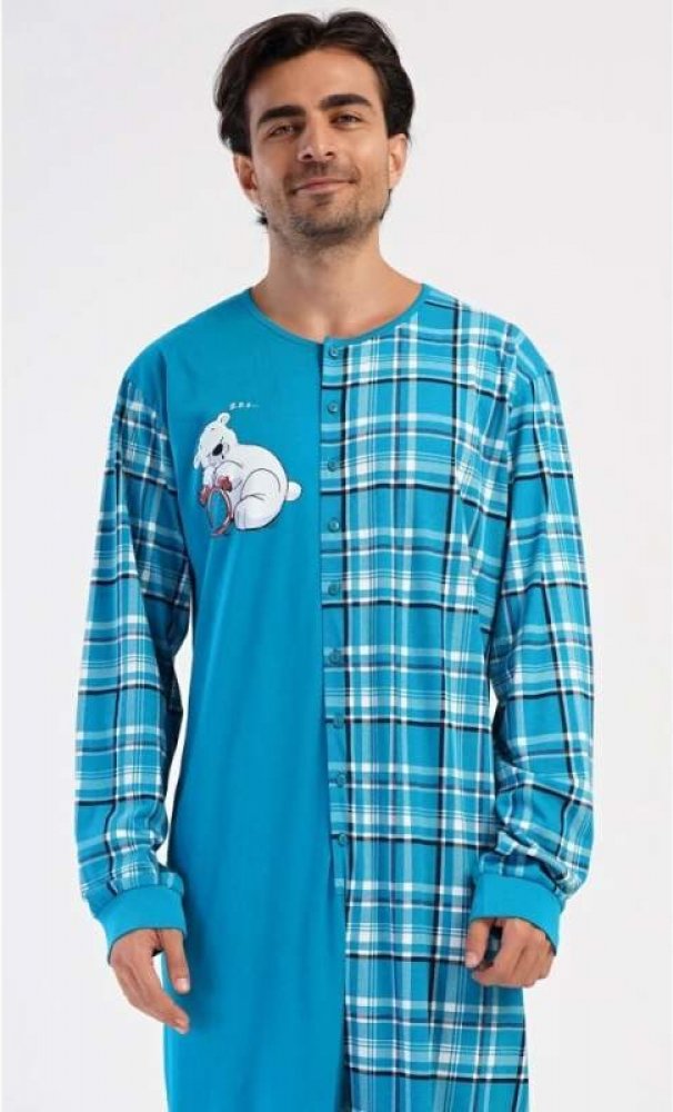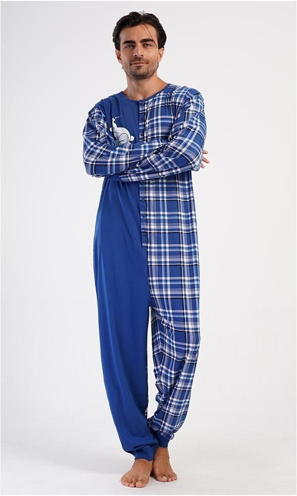 Pánský bavlněný overal Méďa Ospalec. Celopropínací overal zaručuje pohodlné spaní, rukávy a nohavice jsou zakončeny elastickým lemem. Overal se pohledově skládá ze dvou polovin. Jednobarevné, kterou zdobí obrázek ledního medvěda, a kárované, z tohoto materiálu je ušitý i zadní díl a rukávy. Použitý bavlněný materiál je příjemný a poddajný na dotek.Materiál 100% bavlna.