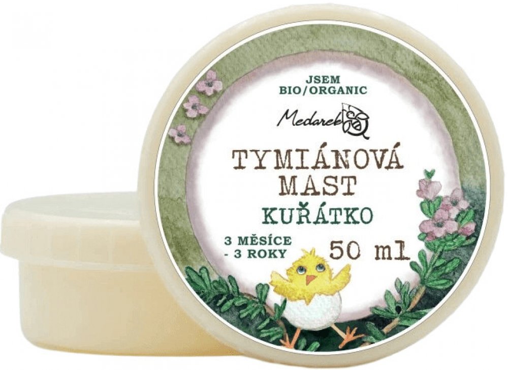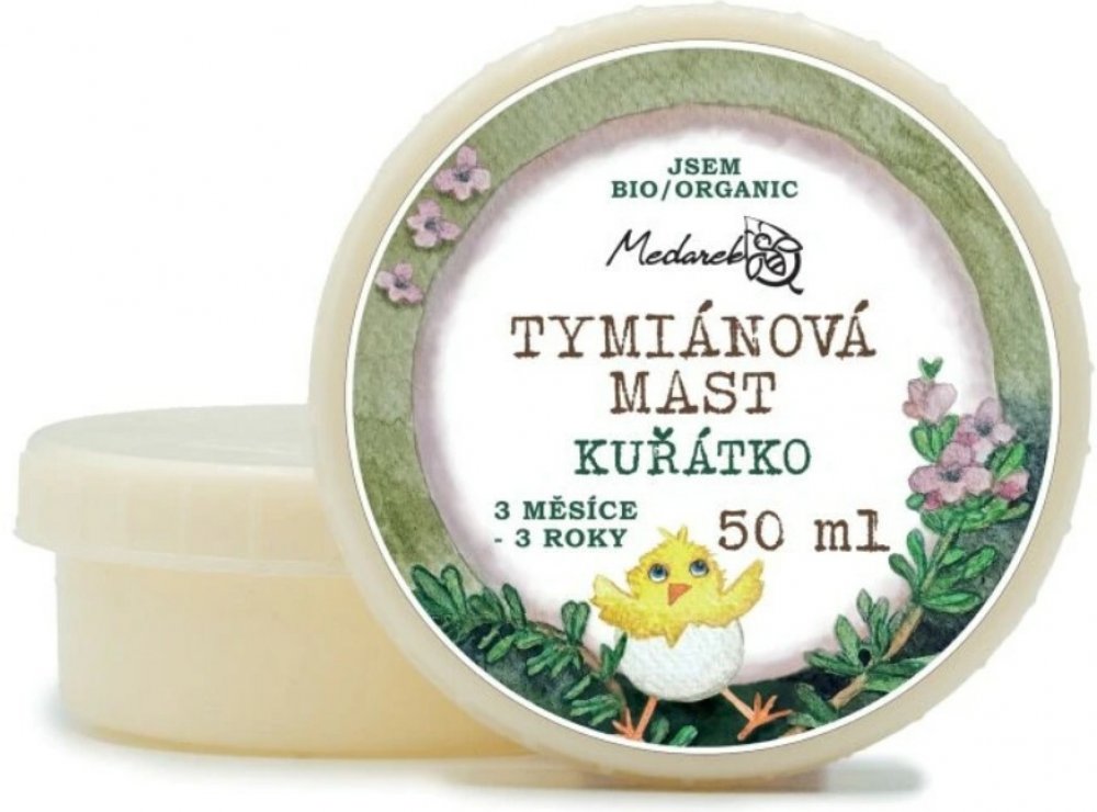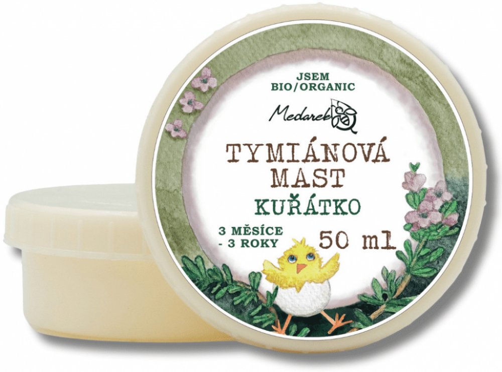 Tymiánová mast Medarek Kuřátko je určena pro ty nejmenší. vhodné při sychravém počasí pro děti od 3 měsíců do 3 let pro mazání na záda a hrudník nutné aplikovat na pokožku bez ekzému a předem vyzkoušet snášenlivost na pokožce Zcela přírodní a 100% bio (organická) mast vhodná používat při sychravém počasí (jinak to kvůli regulaci popsat nemůžu ). Kuřátko je vhodné pro děti od tří měsíců do tří let. Se sestavováním receptury pomáhala vystudovaná aromaterapeutka Bronislava Hradecká. Obsahuje 100% přírodních surovin v organické (bio) kvalitě. Bez vody, parabenů, umělých aromat. Mast má barvu od jemně žluté po zelenou, je to dáno tím, že kmínový olej má tmavší sediment, který se daří více či méně rozvířit a rovnoměrně namíchat do masti. Použití Medarek Tymiánová mast Kuřátko Mazejte na záda nebo hrudník maximálně 3x denně malé množství masti. Vmasírujte do kůže. Zajistěte, aby se dítě namazaného místa nedotýkalo, mohlo by si mast zanést např. do očí, což by štípalo díky esenciálním olejům. Nanášejte pouze na zdravou kůži bez výskytu jakéhokoliv narušení kůže. Po aplikaci si umyjte ruce mýdlem. Doporučujeme nanášet i na noc před spaním. Pokud by kůže reagovala začervenáním, je možné, že je dítě alergické na určitou složku masti (esenciální oleje, mango atp.). V takovém případě mast nepoužívejte. Nepoužívejte preventivně. Mazejte max 1 týden, poté udělejte min. týden pauzu. Mast není vhodná pro těhotné ženy. Složení Nigella Sativa Seed Oil* (bio olej z černého kmínu), Mangifera Indica Seed Butter* (bio mangové máslo), Thymus Vulgaris Oil* (bio tymiánový esenciální olej), Pinus Sylvestris Leaf Oil* (bio borovicový esenciální olej), Linalool* (přirozená součást éterického oleje), Lavandula Angustifolia Oil* (bio levandulový esenciální olej), Limonene* (přirozená součást éterického oleje).