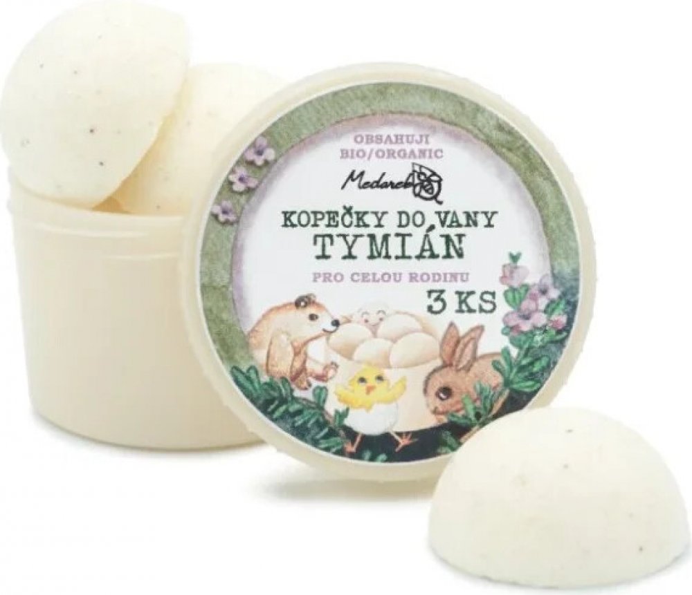 Přírodní koupelové kopečky Medarek tymián s bio mangovým máslem, kmínovým olejem, borovicí a pravěkou solí.Navrženy pro uvolnění, podporu imunity a zklidnění těla i ducha – vhodné, když přijde nachlazení nebo únava. Čím Medarek Kopečky do vany tymián vynikají? Základ tvoří bio mangové máslo a bio kmínový olej, které pokožku promastí, zjemní a zabrání ztrátě vlhkosti. Esenciální oleje tymiánu a borovice přinášejí uvolňující, aromaterapeutické účinky. Pravěká sůl z Utahu (RealSalt™) dodává minerály, působí relaxačně a jemně dezinfekčně. 100 % přírodní složení, bez vody, bez parabenů, syntetických aromat a umělých látek. Jak používat Dávkování na 50 l vody: děti 3 měsíce – 3 roky: ¼ kopečku děti 3–6 let: ½ kopečku děti 6–12 let: 1 kopeček od 12 let: 2 kopečky, dospělí: 3 kopečky Kopečky neobsahují sodu, nešumí → koupel je klidná a jemná. ⚠️ Pozor: po koupeli může být vana kluzká → buďte obezřetní při vstupu i výstupu. Nepoužívejte preventivně. Maximálně 5 dní použití, poté udělejte minimálně týden pauzu. Složení: Mangifera Indica Seed Butter* (bio mangové máslo), Sodium Chloride (pravěká sůl z Utahu), Nigella Sativa Seed Oil* (bio kmínový olej), Pinus Sylvestris Leaf Oil* (bio esenciální olej borovice), Thymus Vulgaris Oil* (bio esenciální olej tymián), Linalool*, Limonene*. * organic/bio surovinyPodtržené suroviny jsou přirozenou součástí esenciálního oleje.