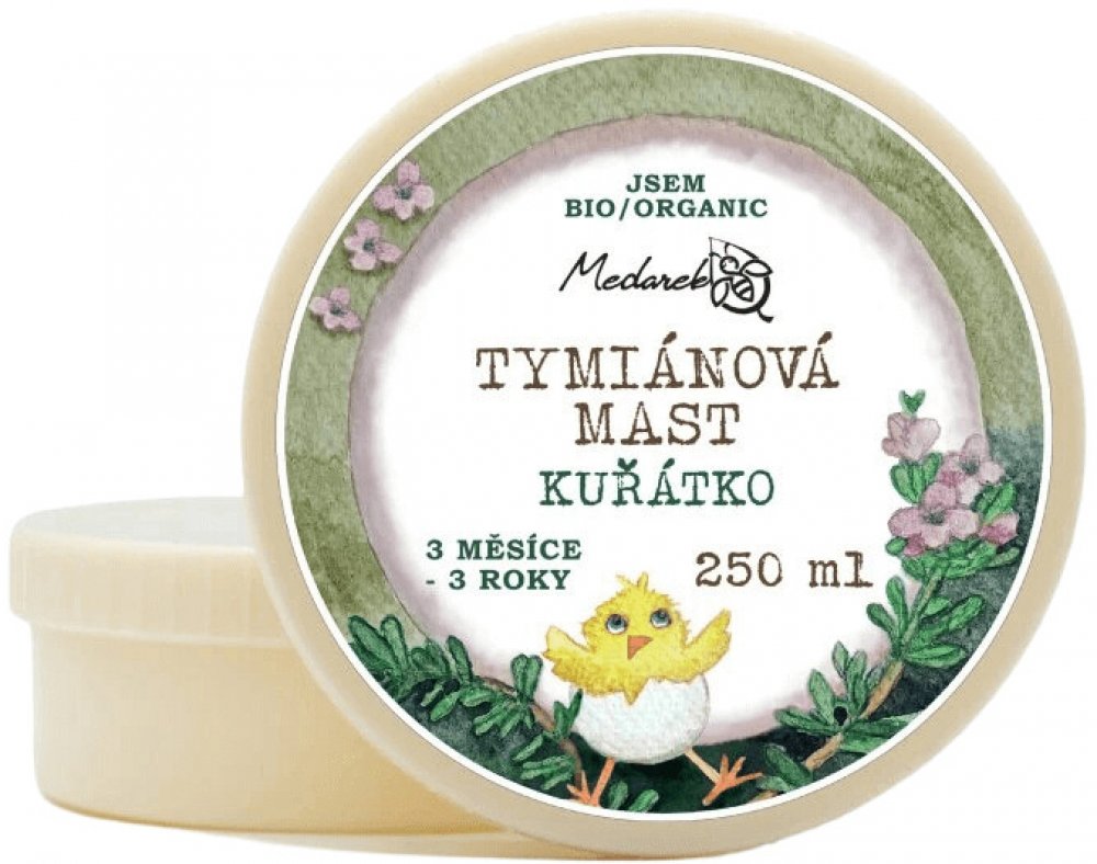 Tymiánová mast Medarek Kuřátko je určena pro ty nejmenší. vhodné při sychravém počasí pro děti od 3 měsíců do 3 let pro mazání na záda a hrudník nutné aplikovat na pokožku bez ekzému a předem vyzkoušet snášenlivost na pokožce Zcela přírodní a 100% bio (organická) mast vhodná používat při sychravém počasí (jinak to kvůli regulaci popsat nemůžu ). Kuřátko je vhodné pro děti od tří měsíců do tří let. Se sestavováním receptury pomáhala vystudovaná aromaterapeutka Bronislava Hradecká. Obsahuje 100% přírodních surovin v organické (bio) kvalitě. Bez vody, parabenů, umělých aromat. Mast má barvu od jemně žluté po zelenou, je to dáno tím, že kmínový olej má tmavší sediment, který se daří více či méně rozvířit a rovnoměrně namíchat do masti. Použití Medarek Tymiánová mast Kuřátko Mazejte na záda nebo hrudník maximálně 3x denně malé množství masti. Vmasírujte do kůže. Zajistěte, aby se dítě namazaného místa nedotýkalo, mohlo by si mast zanést např. do očí, což by štípalo díky esenciálním olejům. Nanášejte pouze na zdravou kůži bez výskytu jakéhokoliv narušení kůže. Po aplikaci si umyjte ruce mýdlem. Doporučujeme nanášet i na noc před spaním. Pokud by kůže reagovala začervenáním, je možné, že je dítě alergické na určitou složku masti (esenciální oleje, mango atp.). V takovém případě mast nepoužívejte. Nepoužívejte preventivně. Mazejte max 1 týden, poté udělejte min. týden pauzu. Mast není vhodná pro těhotné ženy. Složení Nigella Sativa Seed Oil* (bio olej z černého kmínu), Mangifera Indica Seed Butter* (bio mangové máslo), Thymus Vulgaris Oil* (bio tymiánový esenciální olej), Pinus Sylvestris Leaf Oil* (bio borovicový esenciální olej), Linalool* (přirozená součást éterického oleje), Lavandula Angustifolia Oil* (bio levandulový esenciální olej), Limonene* (přirozená součást éterického oleje).
