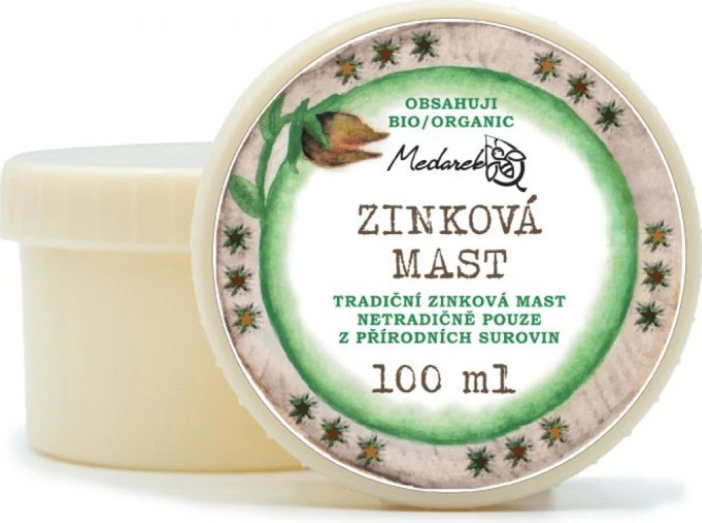 Základem zinkové mastičky je výživné bambucké máslo, které zjemňuje, zklidňuje a urychluje hojení. Jojobový olej má výborné protizánětlivé a hojivé účinky. Vitamin E je jeden z nejdůležitějších antioxidantů, které chrání kožní buňky před podrážděním a přirozenou cestou konzervuje produkt.