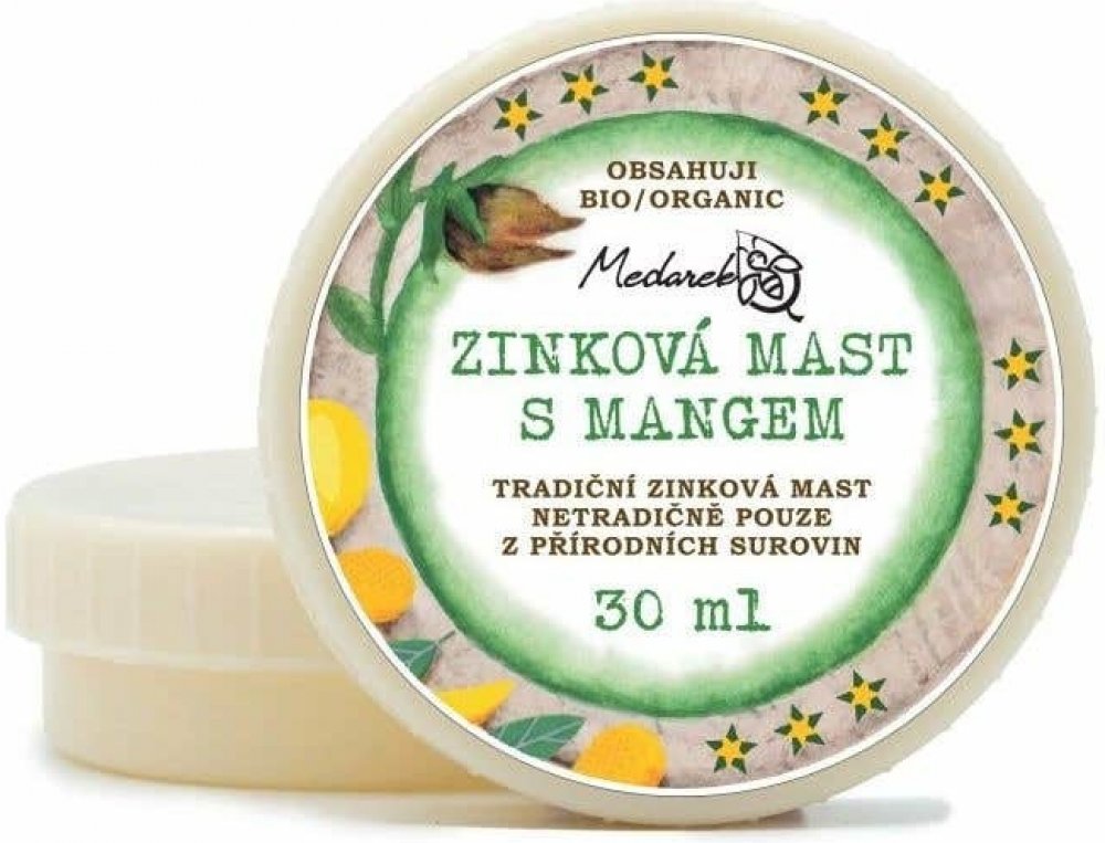 Naše zinková mast v klasické verzi, pouze jsme vyměnili bambucké máslo za mangové. Část zákazníků má totiž alergii na ořechy, která se projevovala i u bambuckého másla.