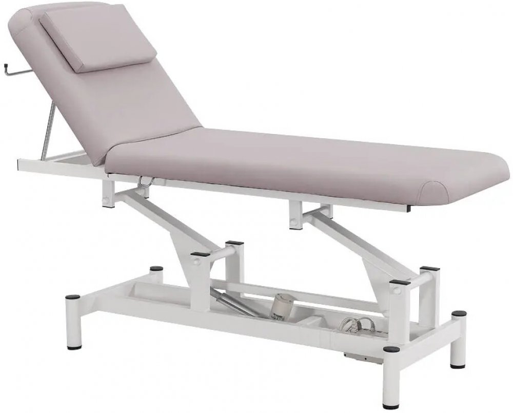 jednomotorové lehátko s elektrickým nastavením výšky stolu, 2-segmentové, hlavový segment ručně stavitelný pomocí ocelové vzpěry; vybaven podhlavníkem, kovová konstrukce opatřena práškovým lakem v bílé barvě